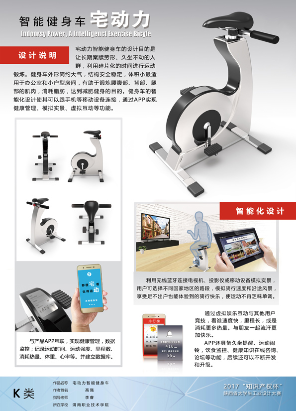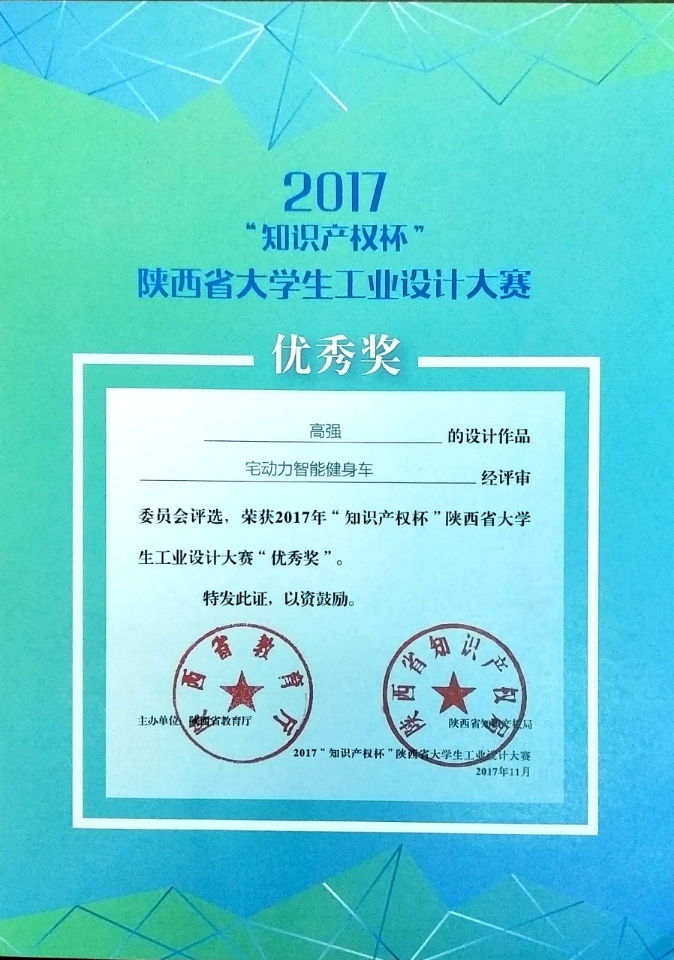 近日,陕西省教育厅和省知识产权局联合公布了2017年“知识产权杯”陕西省老员工工业设计大赛获奖名单,bw西汉姆联计算机1602班员工高强的作品“宅动力智能健身车”获得大赛优秀奖,指导老师为bw西汉姆联教师李睿。