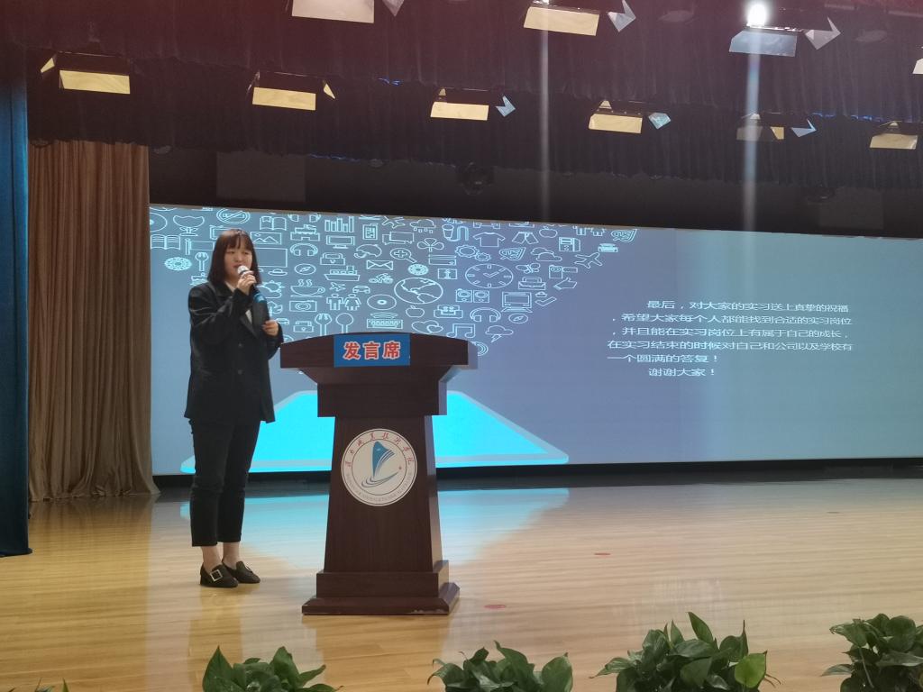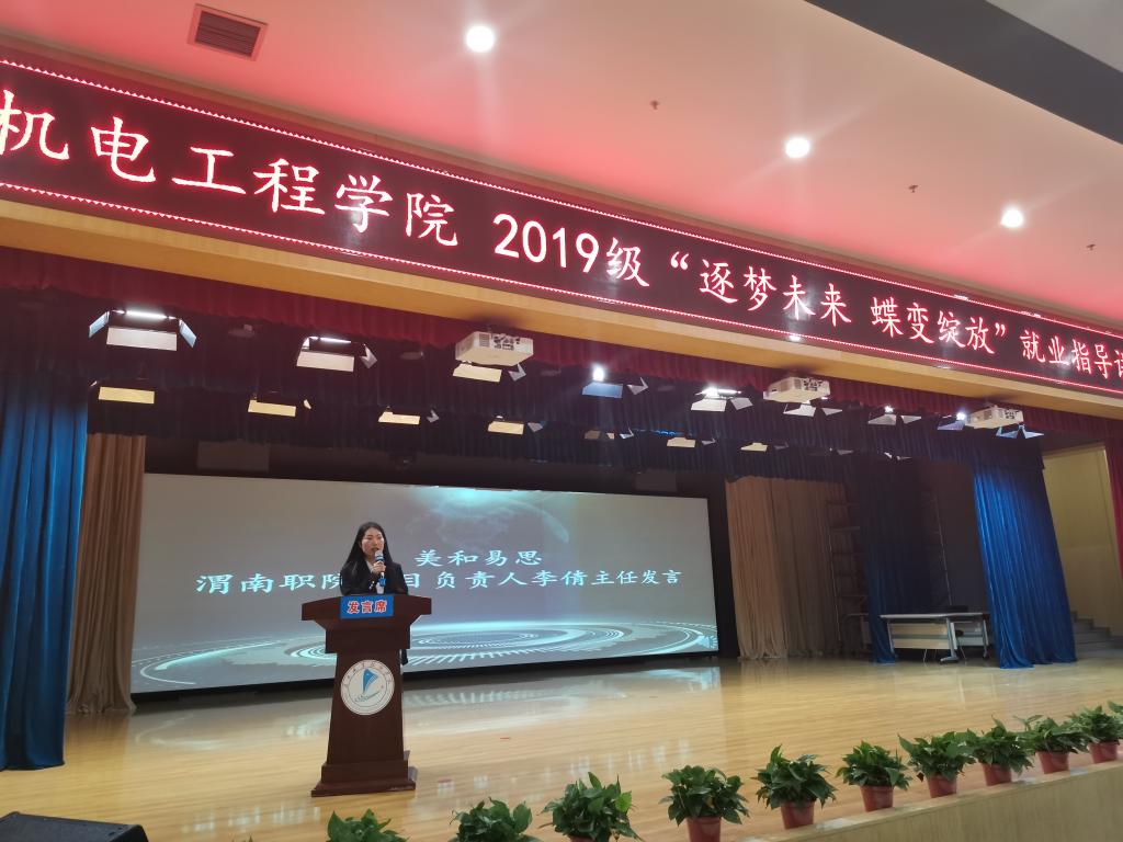 本次就讲座邀请人才招聘处有关领导出席,机电公司副经理王勇、招就科负责人罗彦庆,美和易思项目负责人李倩、学术负责人杨宁参会,同时也邀请到阳光雨露公司人力资源总监王丽娟为2021届顶岗实习员工作就业指导报告。