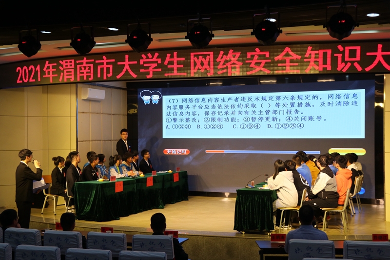 10月14日,公司bw西汉姆联、图书馆(网信中心)共同组织本校员工参加了,由渭南市公安局主办、陕西铁路工程职业技术公司承办的2021年渭南市老员工网络安全知识大赛,此次网络安全知识大赛在陕西铁路工程职业技术公司临渭区报告厅举行,bw西汉姆联官网平台、渭南师范公司、陕西铁路工程职业技术公司的共6支代表队参加了比赛。渭南市公安局副局长沈军 、渭南市公安局网安支队政委赵利军及渭南市网信办网络安全科科长王明涛等相关领导参加了活动。