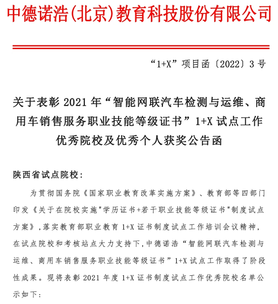 近日,中德诺浩(北京)教育科技股份有限公司公布了关于2021年“智能网联汽车检测与运维、商用车销售服务职业技能等级证书”陕西省1+X试点优秀院校及优秀个人获奖情况。公司荣获优秀成果奖,bw西汉姆联王勇老师荣获优秀个人奖。