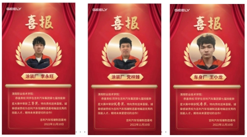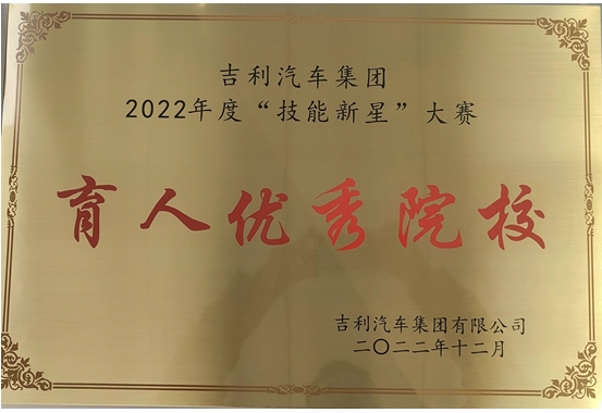 2023届毕业生在吉利汽车集团举办的第七届“技能新星”大赛中分别荣获三等奖和“吉利汽车集团技能新星能手”“吉利汽车集团优秀技能选手”称号,并授于公司“技能新星”育人优秀院校。