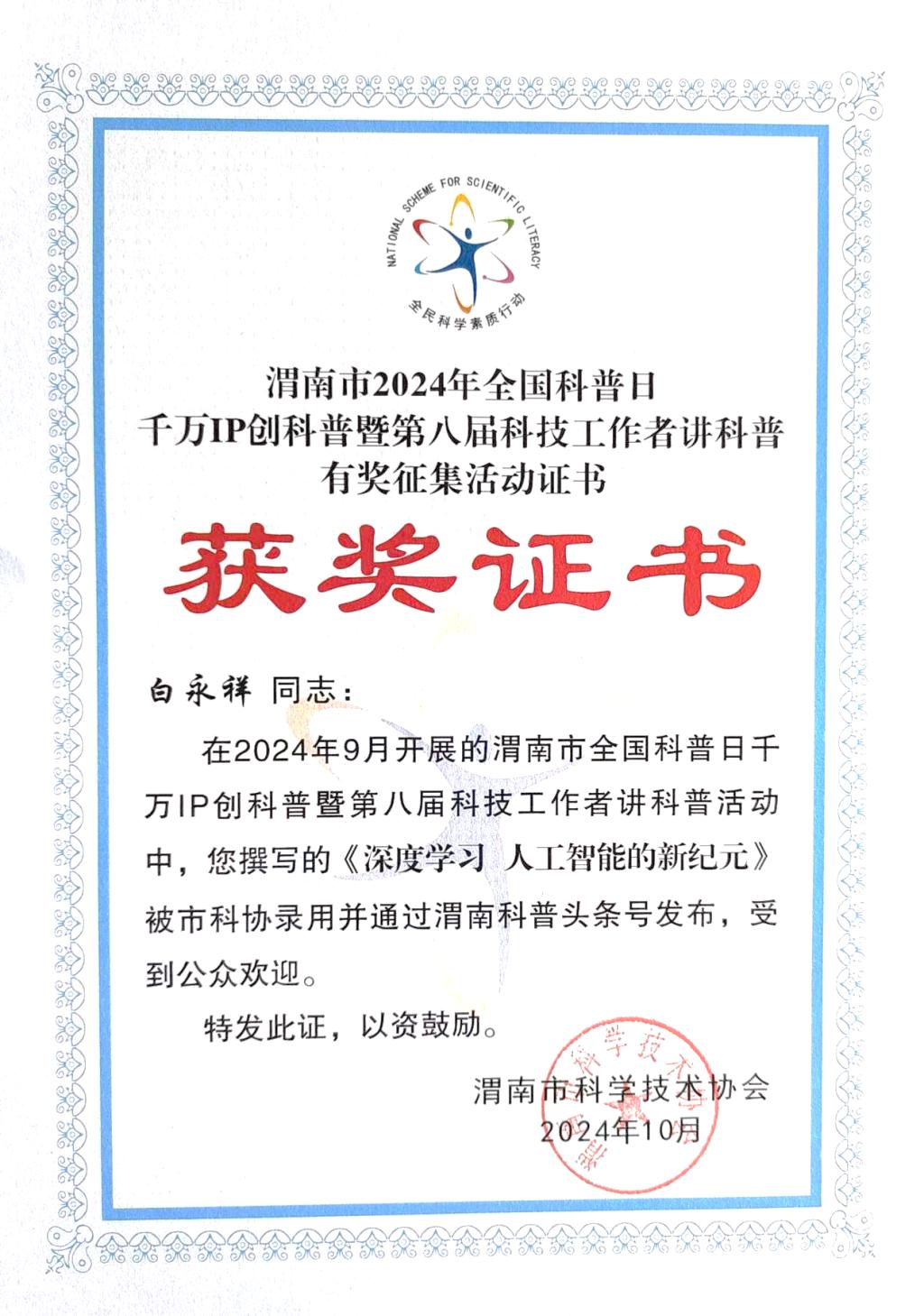 花开有时,灼灼其华。在渭南市2024年全国科普日千万IP创科普暨第八届科技工作者讲科普有奖征集活动中,bw西汉姆联教师白永祥教授创作的《深度学习 人工智能的新纪元》科普作品被市科协录用并通过渭南科普头条号发表。此次获奖,充分反映了公司持续发挥人才资源优势,积极面向社会公众开展科普活动所取得的显著成效。