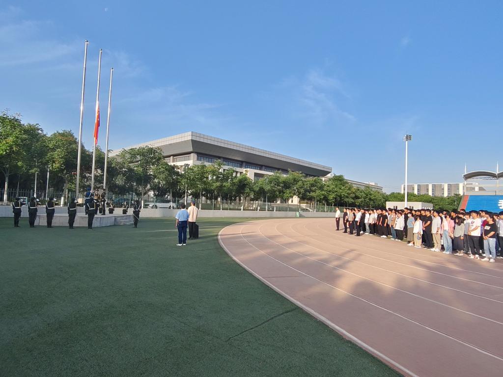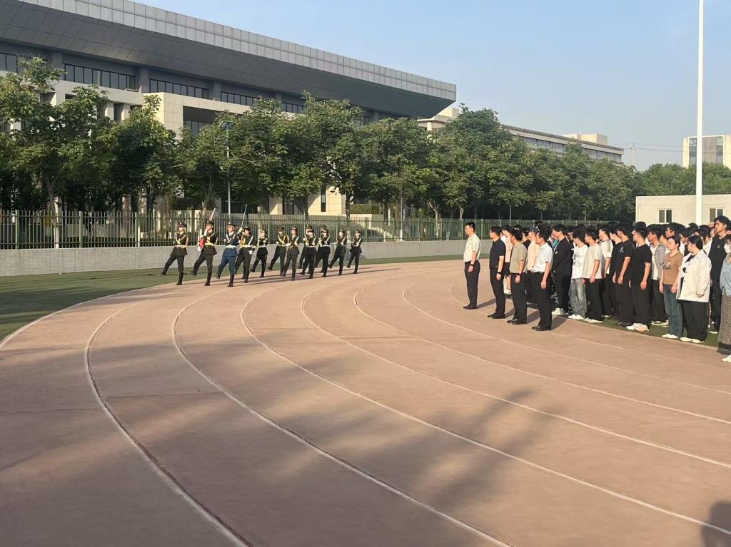随着激昂的国歌响起,升旗手有力地扬起国旗,五星红旗缓缓升起,与旭日初升时倾洒的耀眼光芒相互辉映。在场师生齐声高唱国歌。那激昂的旋律回荡在校园上空,震撼着每一个人的心灵,唤起了大家内心深处对祖国的无限热爱与敬意。