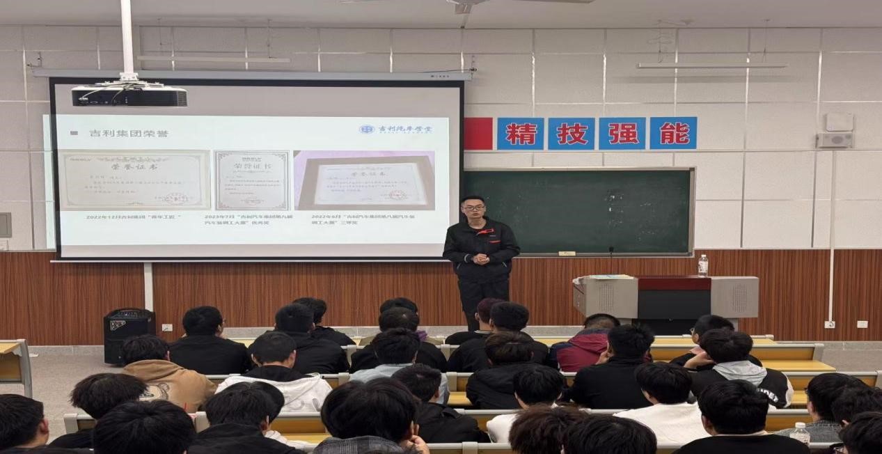 报告中,李兴旺详细阐述了吉利汽车集团在技术创新、产品研发和市场拓展方面的最新成果,新能源汽车发展及其对未来汽车行业的影响,以鼓励同学们抓住机遇,勇于挑战自我,探索未知领域。同时,他也从自己的成长经历出发,讲述了自己从一名普通的总装厂一线实习生,历任总装厂装配工、返修工、班长职位,以及多次参加技能大赛、荣获装配技能比赛一等奖、西安吉利最高荣誉“光辉奖”、集团“青年工匠”、西安市总工会先进个人称号的奋斗历程,用他的故事激励着参会的每一位同学,让大家深刻认识到工匠精神的重要性和价值。同学们深受启发,在互动环节中,积极提问关于职业选择、技能提升、行业发展趋势等方面内容,李兴旺耐心解答,并分享自己的心得体会,鼓励同学们要树立明确的职业目标,不断学习新知识、新技能,为实现自己的梦想而努力奋斗。